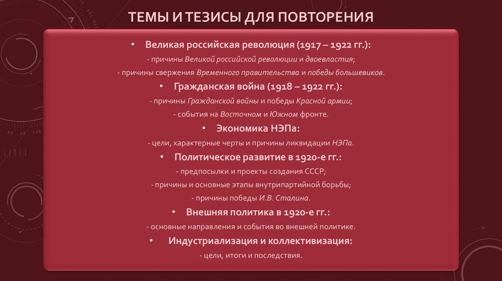ТЕМЫ И ТЕЗИСЫ ДЛЯ ПОВТОРЕНИЯ• Великая российская революция (1917 – 1922 гг.):