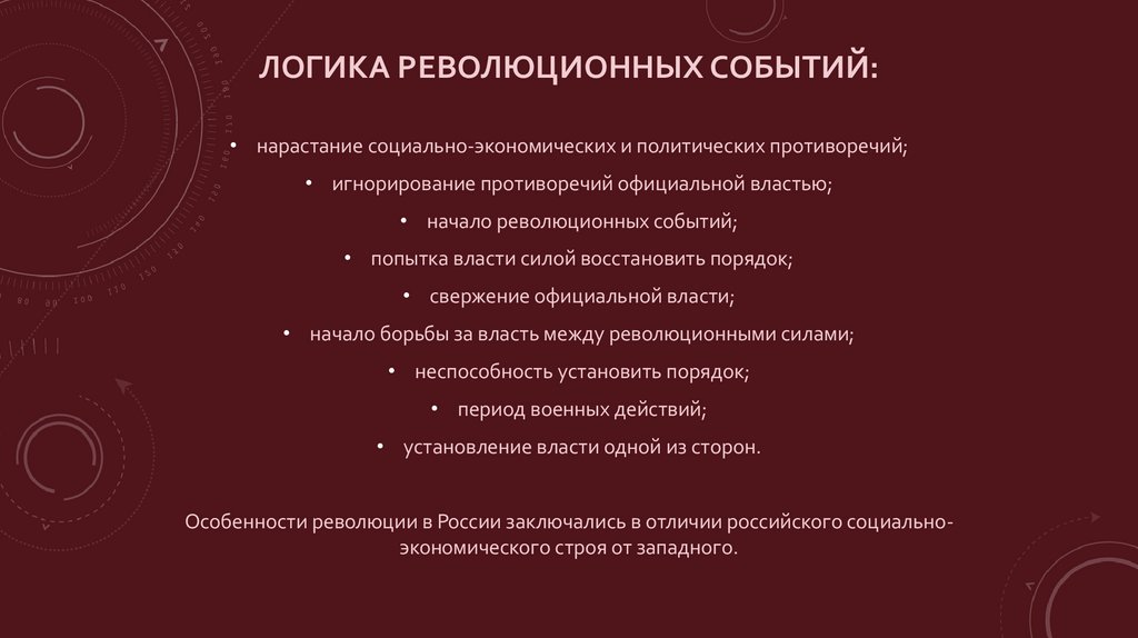ЛОГИКА РЕВОЛЮЦИОННЫХ СОБЫТИЙ:• нарастание социально-экономических и политических противоречий;