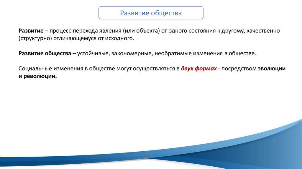 Развитие обществаРазвитие – процесс перехода явления (или объекта) от одного состояния к другому, качественно