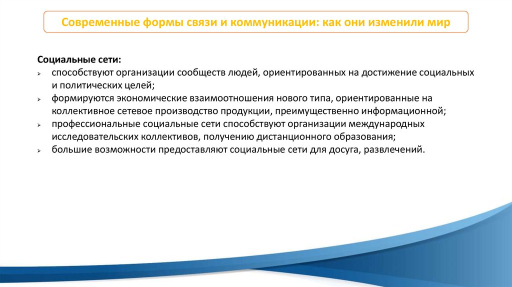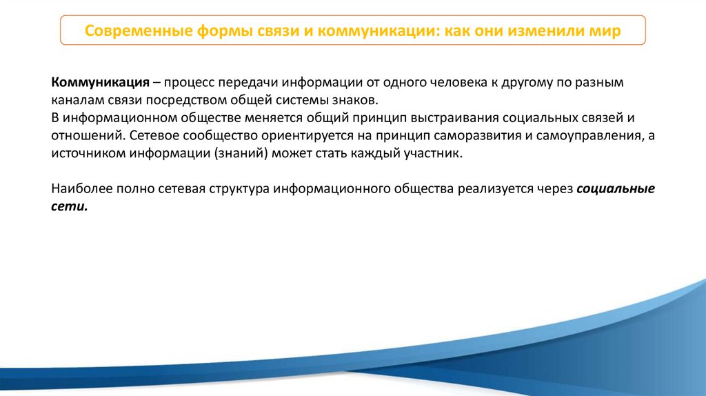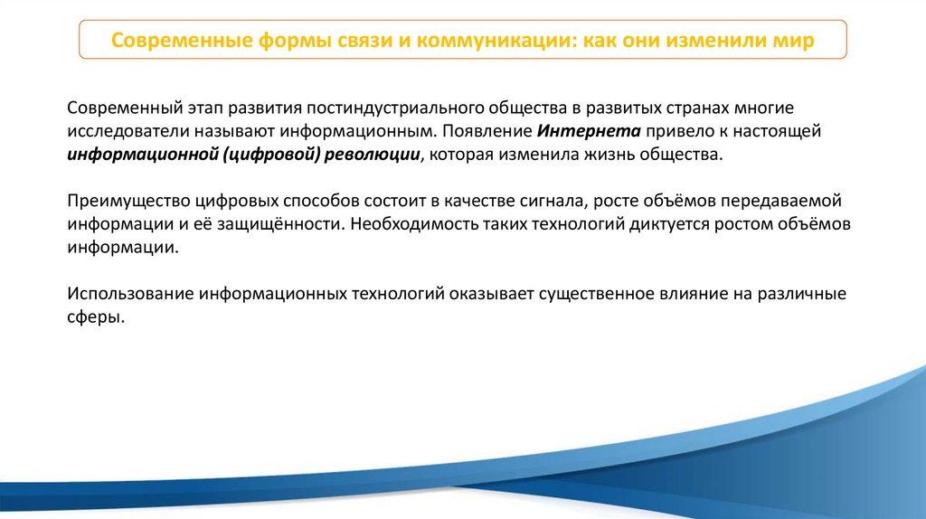 Современные формы связи и коммуникации: как они изменили мирСовременный этап развития постиндустриального общества в развитых странах многие