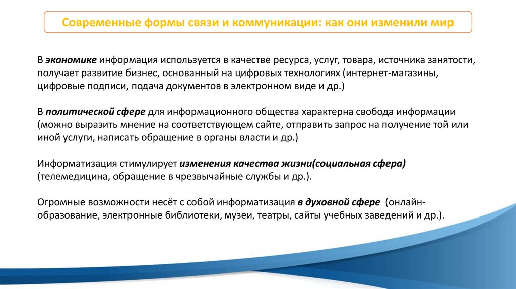 Современные формы связи и коммуникации: как они изменили мирВ экономике информация используется в качестве ресурса, услуг, товара, источника занятости,