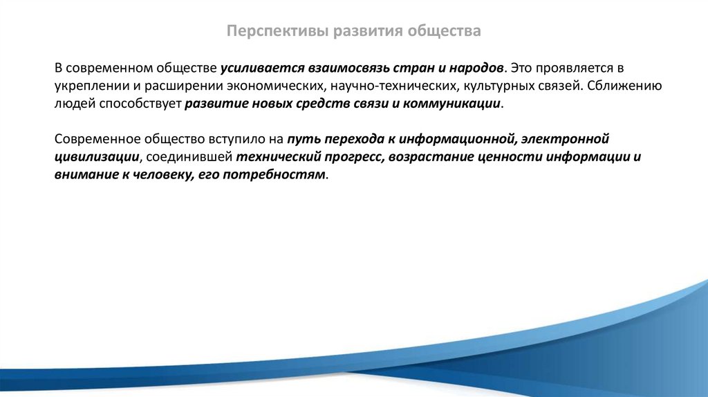 Перспективы развития обществаВ современном обществе усиливается взаимосвязь стран и народов. Это проявляется в