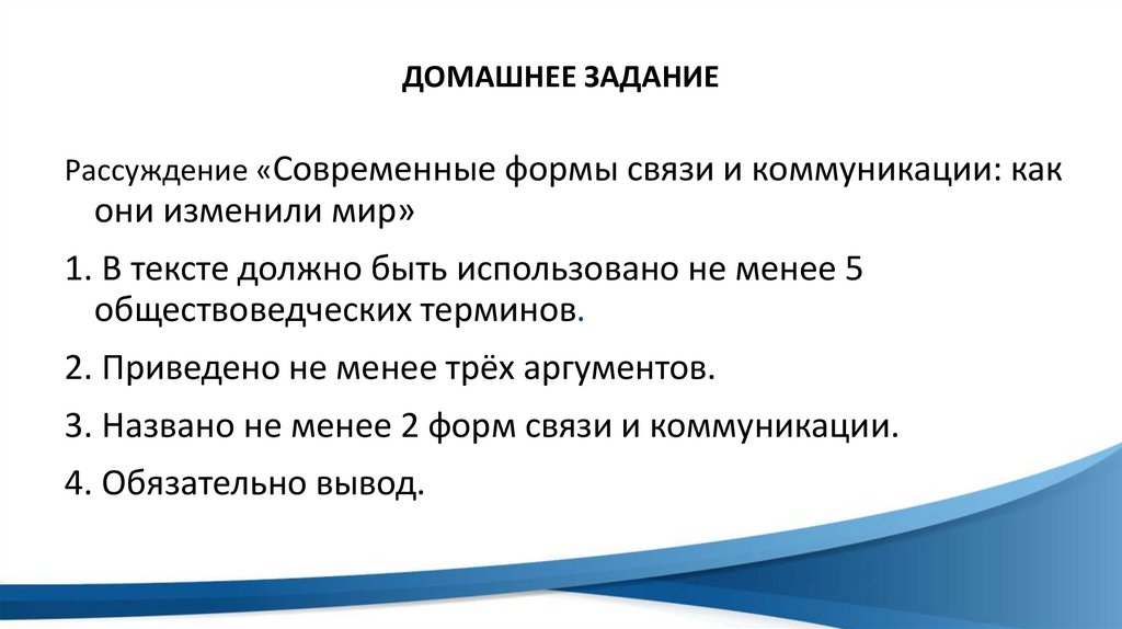 ДОМАШНЕЕ ЗАДАНИЕРассуждение «Современные формы связи и коммуникации: как