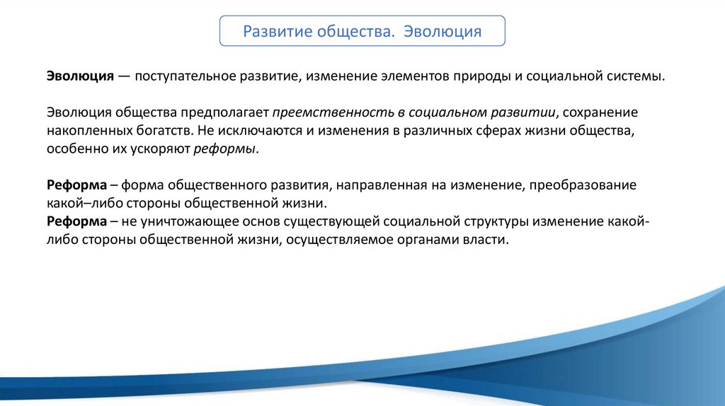 Развитие общества. ЭволюцияЭволюция — поступательное развитие, изменение элементов природы и социальной системы.