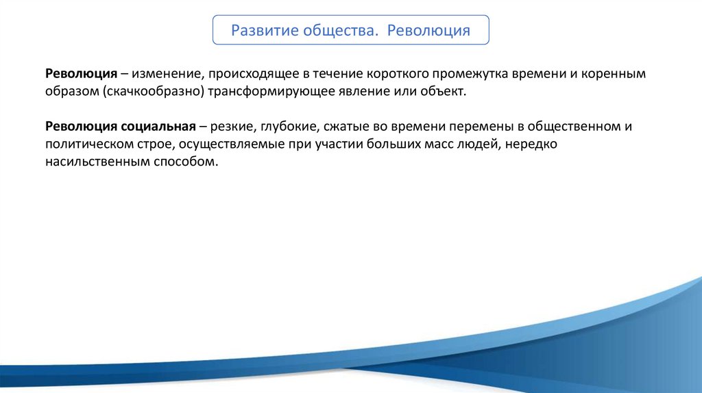 Развитие общества. РеволюцияРеволюция – изменение, происходящее в течение короткого промежутка времени и коренным