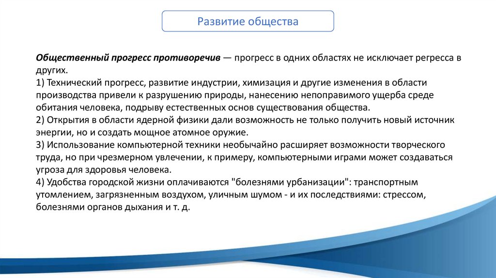 Развитие обществаОбщественный прогресс противоречив — прогресс в одних областях не исключает регресса в