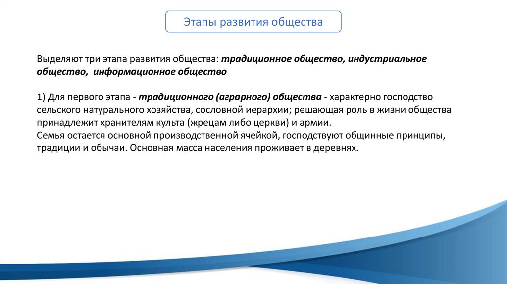 Этапы развития обществаВыделяют три этапа развития общества: традиционное общество, индустриальное