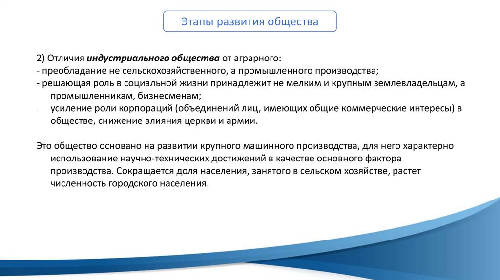 Этапы развития общества2) Отличия индустриального общества от аграрного: