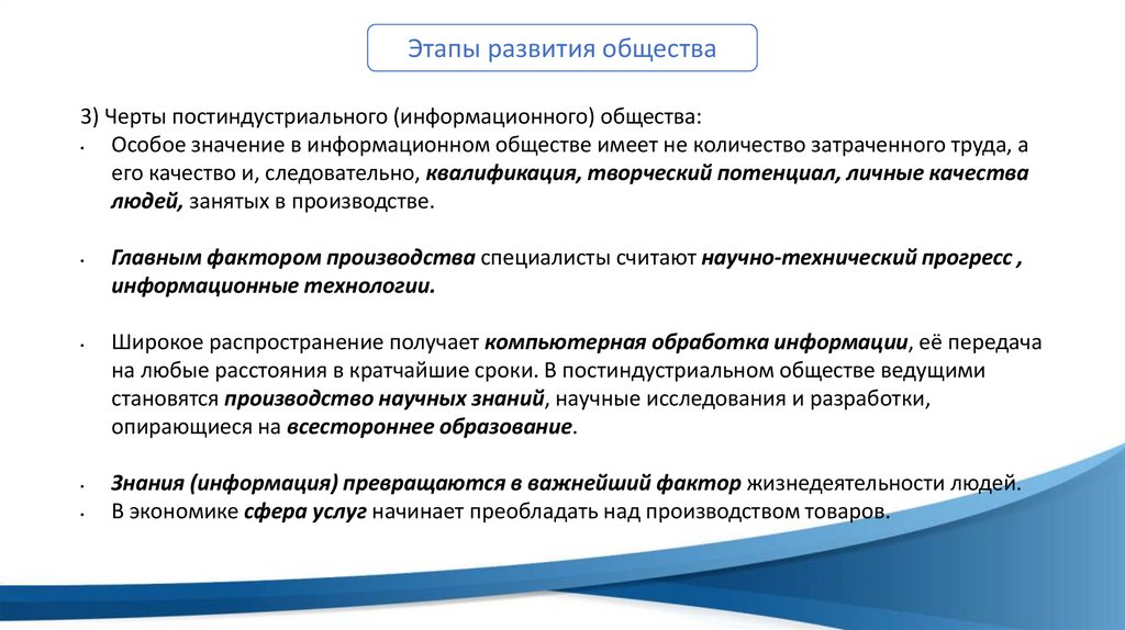 Этапы развития общества3) Черты постиндустриального (информационного) общества: