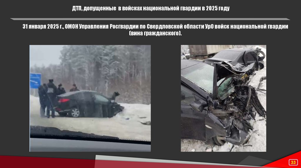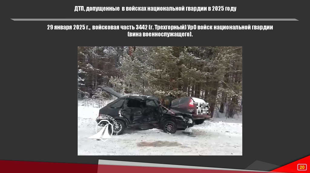 ДТП, допущенные в войсках национальной гвардии в 2025 году29 января 2025 г., войсковая часть 3442 (г. Трехгорный) УрО войск национальной гвардии