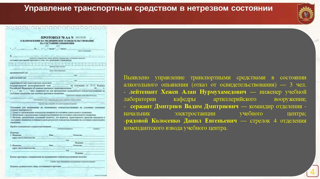 Управление транспортным средством в нетрезвом состоянииВыявлено управление транспортными средствами в состоянии