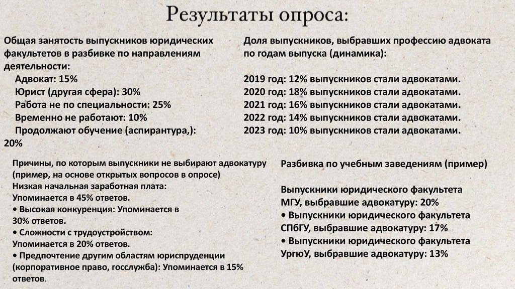 Общая занятость выпускников юридическихфакультетов в разбивке по направлениям