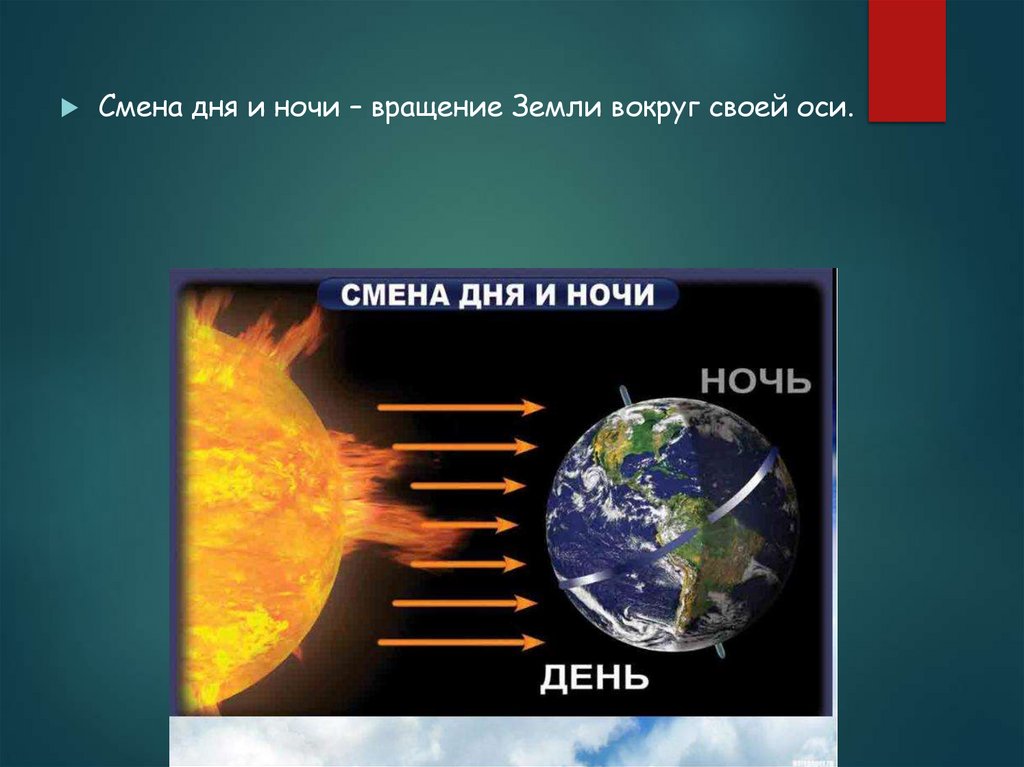 Смена дня и ночи – вращение Земли вокруг своей оси.14.