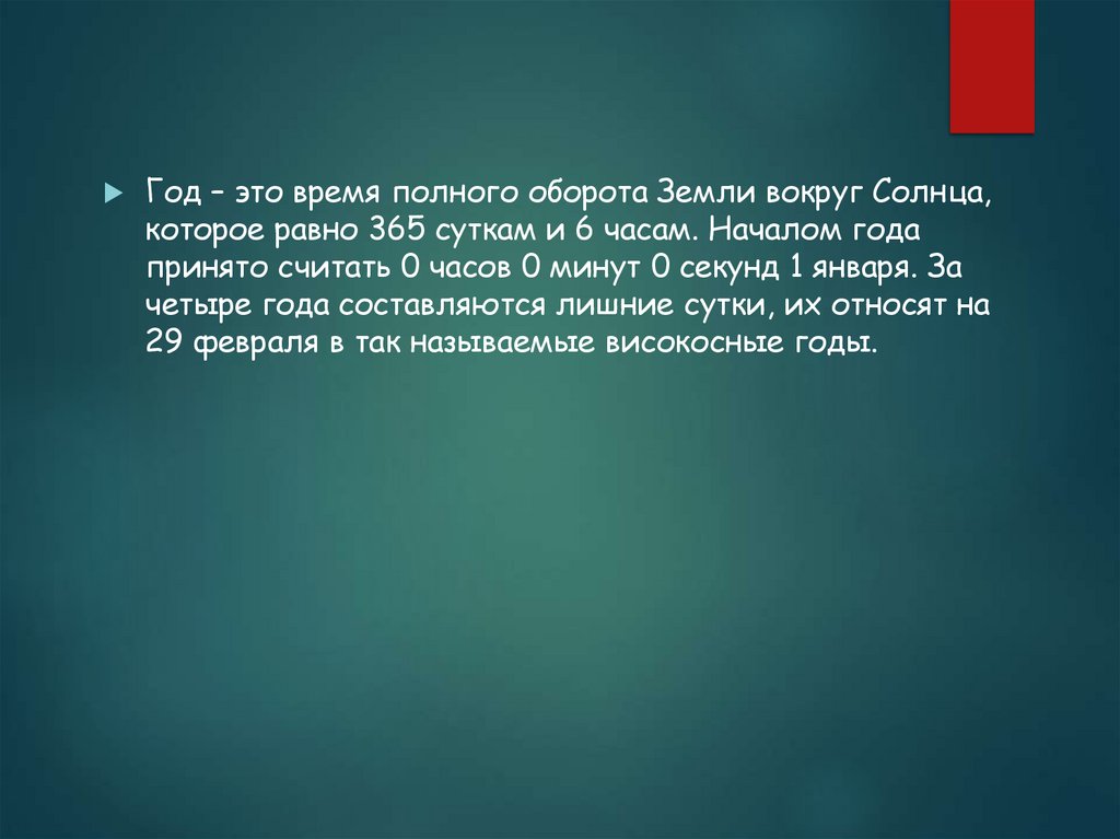 Год – это время полного оборота Земли вокруг Солнца,которое равно 365 суткам и 6 часам. Началом года