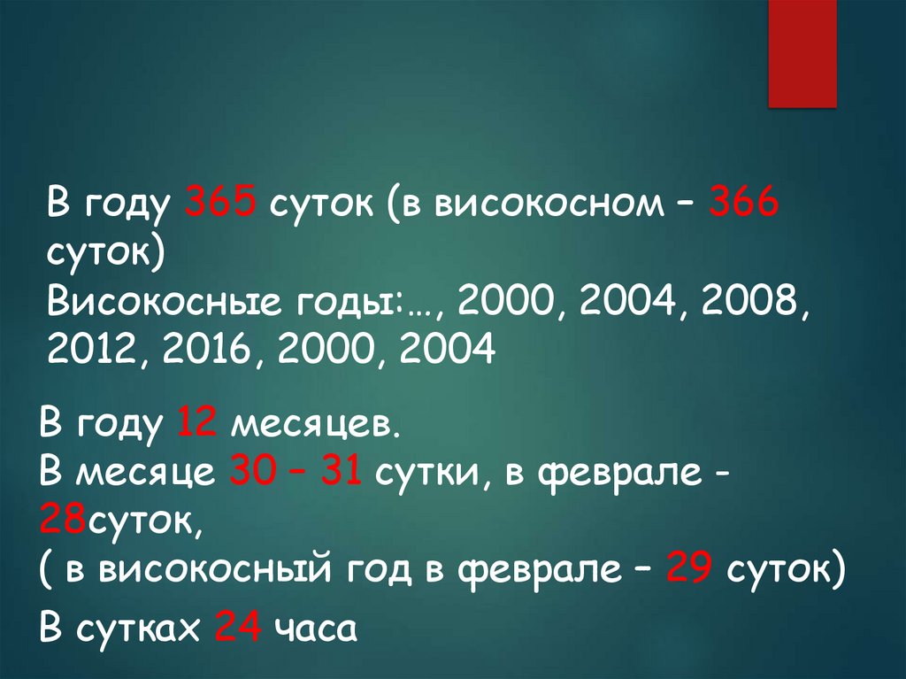 В месяце 30 – 31 сутки, в феврале 28суток,