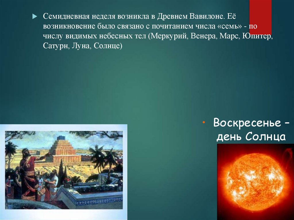 Семидневная неделя возникла в Древнем Вавилоне. Еёвозникновение было связано с почитанием числа «семь» - по