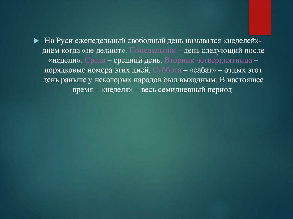 На Руси еженедельный свободный день назывался «неделей»днём когда «не делают». Понедельник – день следующий после«недели». Среда – средний день. Вторник четверг,пятница –