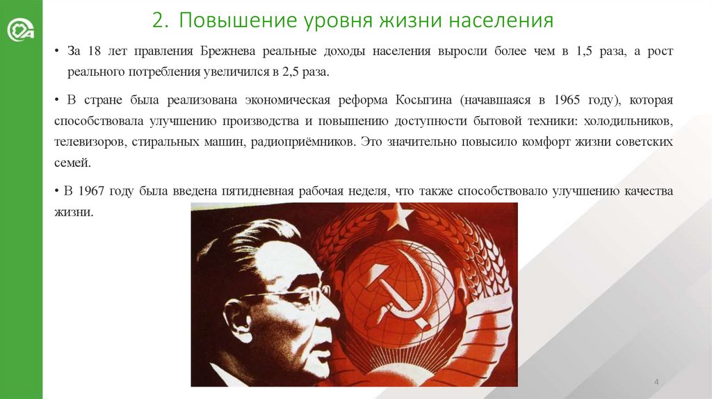 2. Повышение уровня жизни населения• За 18 лет правления Брежнева реальные доходы населения выросли более чем в 1,5 раза, а рост