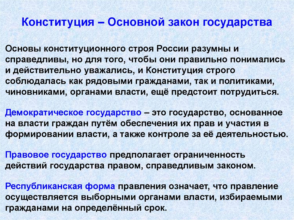Конституция – Основной закон государстваОсновы конституционного строя России разумны и