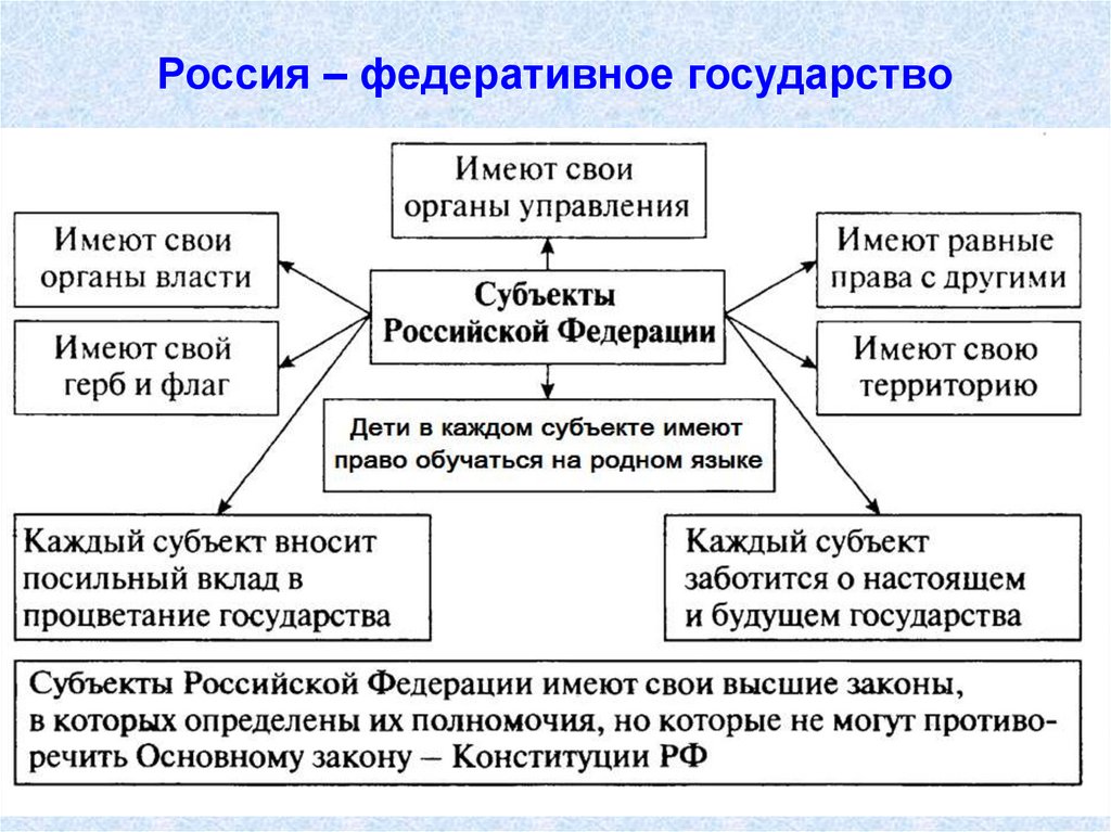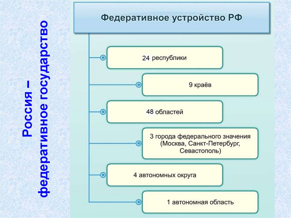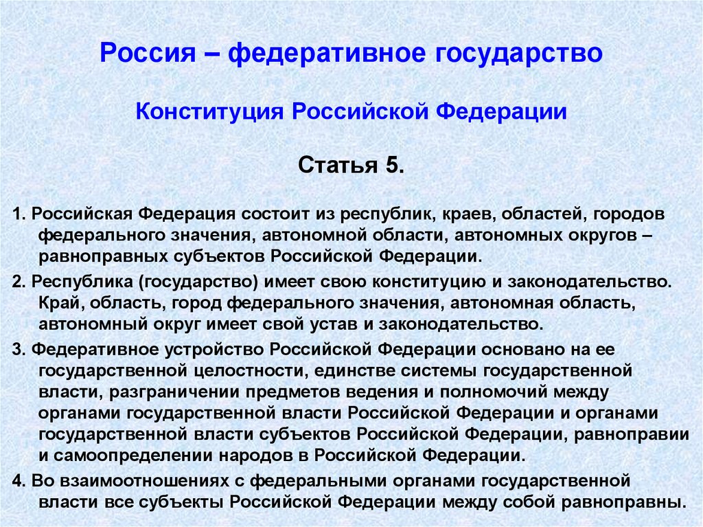 1. Российская Федерация состоит из республик, краев, областей, городов