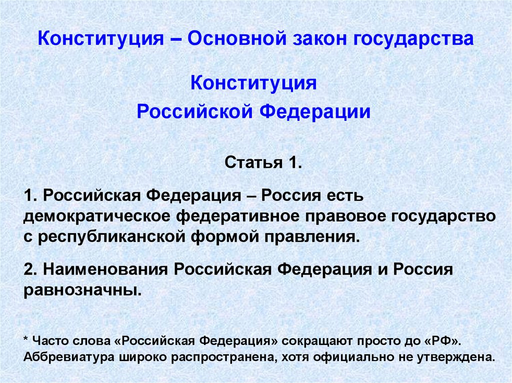 * Часто слова «Российская Федерация» сокращают просто до «РФ».