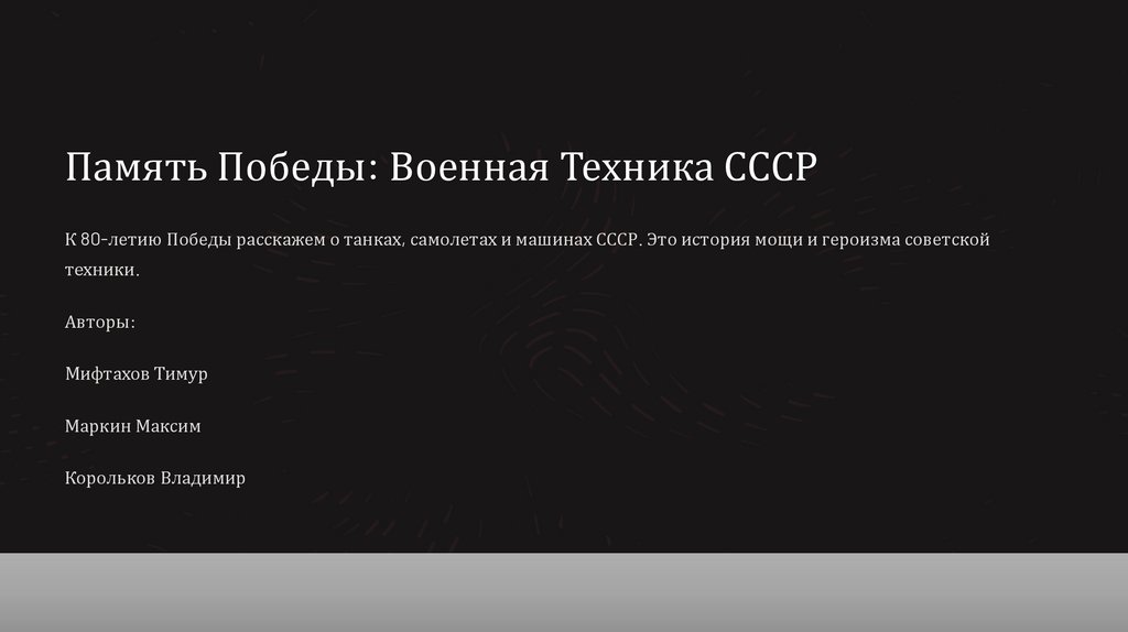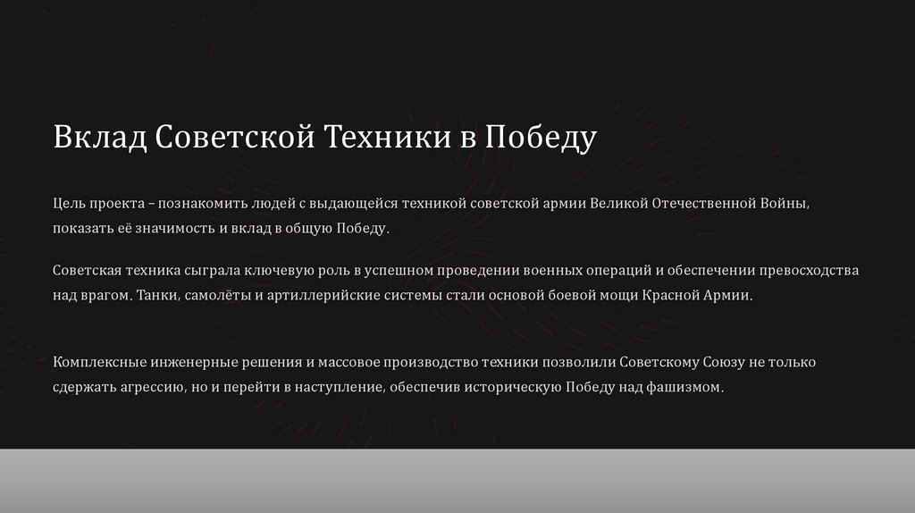 Вклад Советской Техники в ПобедуЦель проекта – познакомить людей с выдающейся техникой советской армии Великой Отечественной Войны,