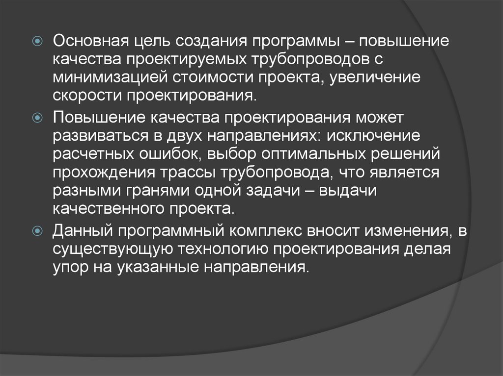 Основная цель создания программы – повышениекачества проектируемых трубопроводов с