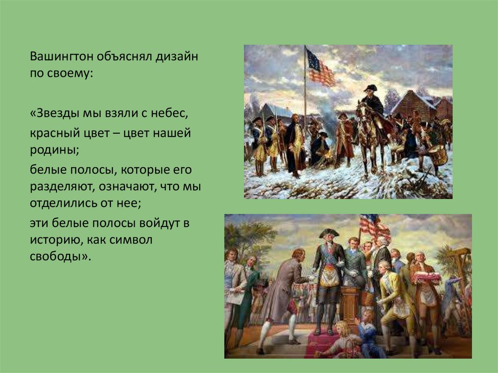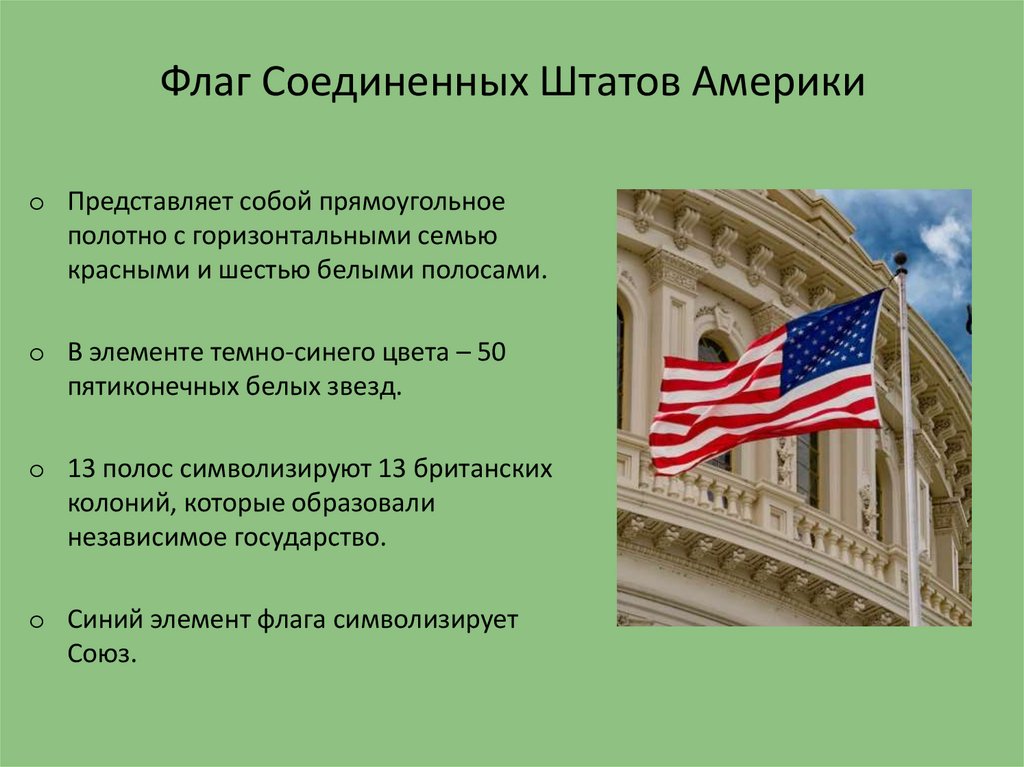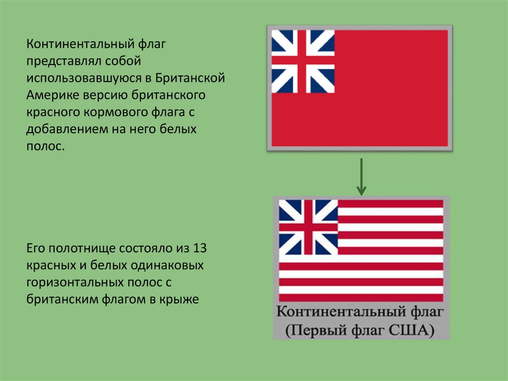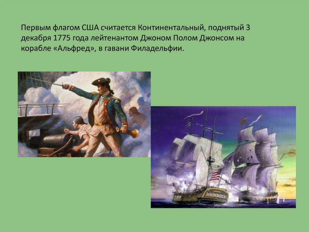 Первым флагом США считается Континентальный, поднятый 3декабря 1775 года лейтенантом Джоном Полом Джонсом на