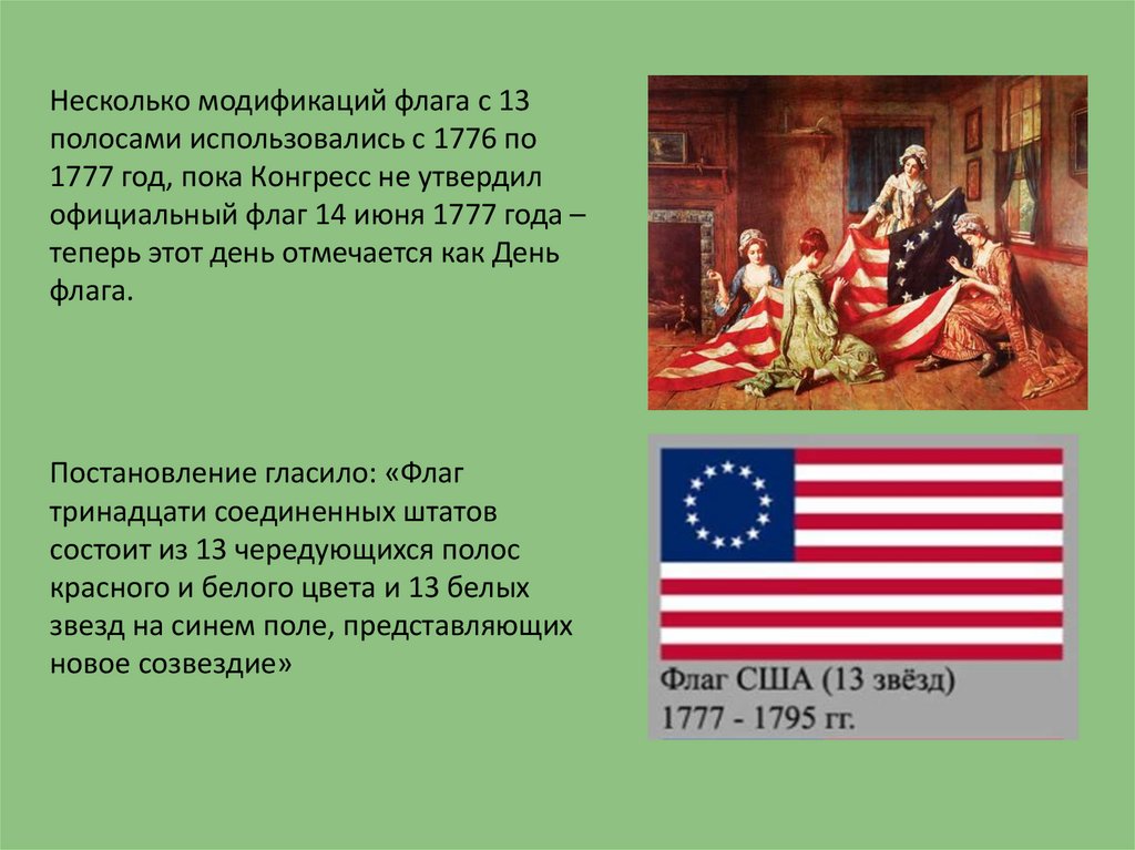 Несколько модификаций флага с 13полосами использовались с 1776 по