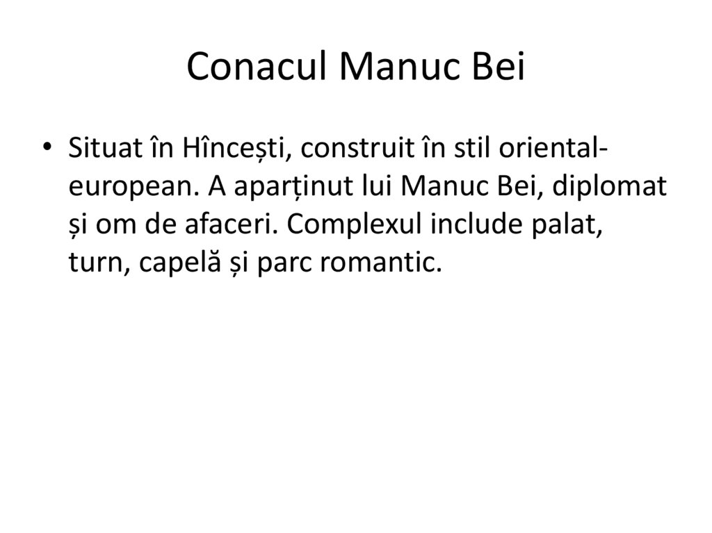 Conacul Manuc Bei• Situat în Hîncești, construit în stil orientaleuropean. A aparținut lui Manuc Bei, diplomat