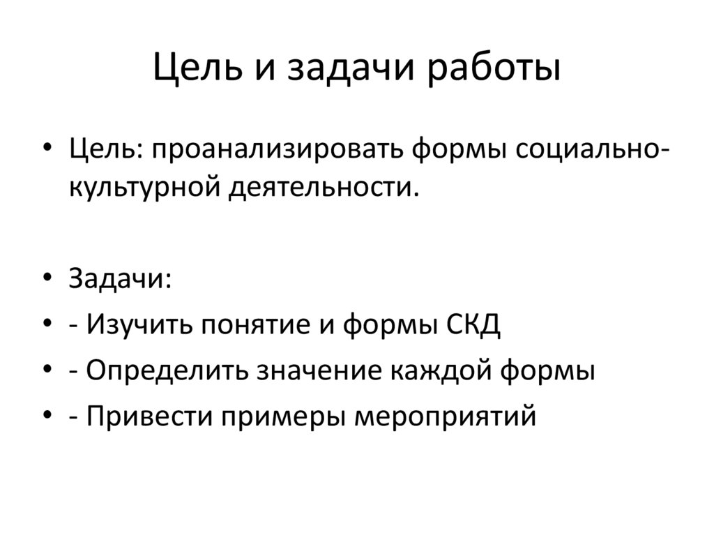 Цель и задачи работы• Цель: проанализировать формы социальнокультурной деятельности.