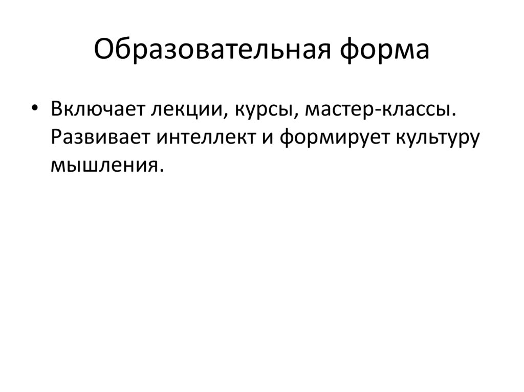 Образовательная форма• Включает лекции, курсы, мастер-классы.