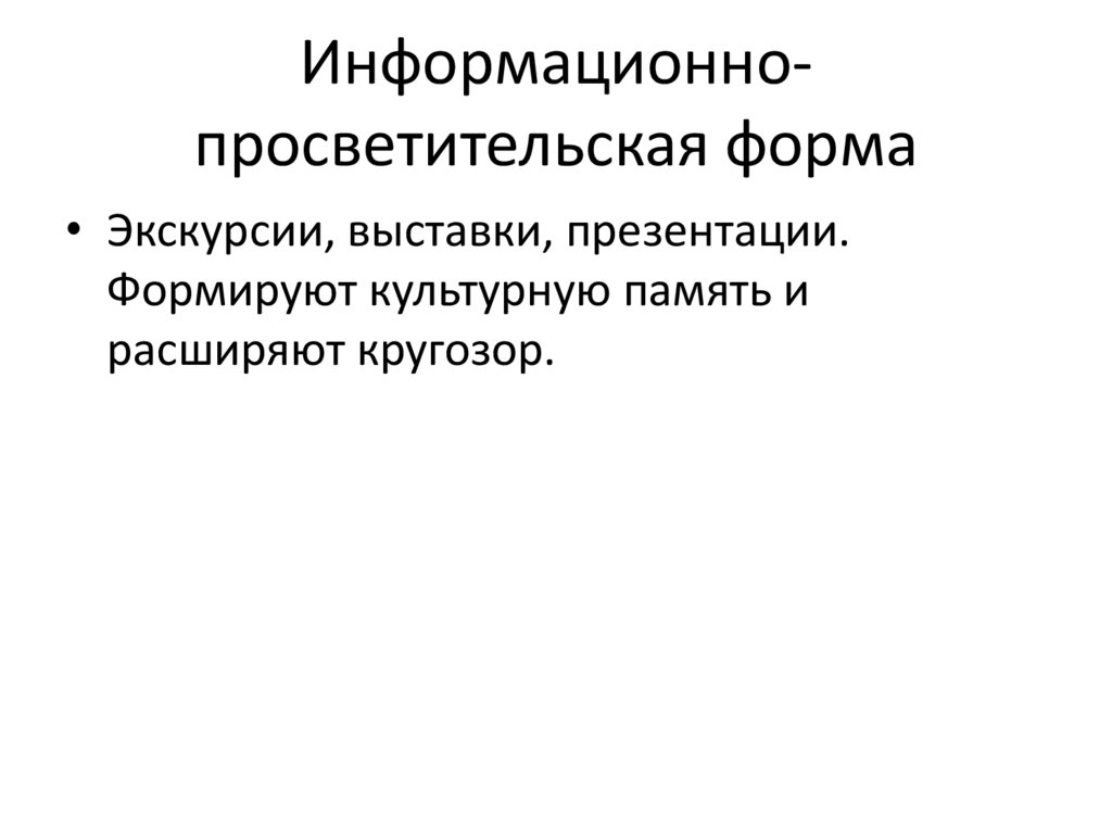 Информационнопросветительская форма• Экскурсии, выставки, презентации.