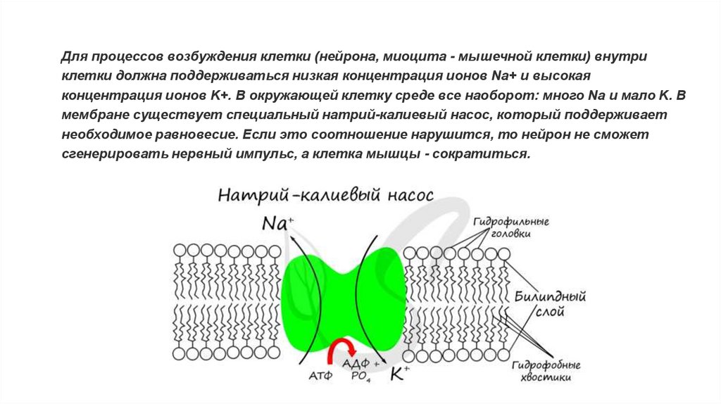 Для процессов возбуждения клетки (нейрона, миоцита - мышечной клетки) внутриклетки должна поддерживаться низкая концентрация ионов Na+ и высокая