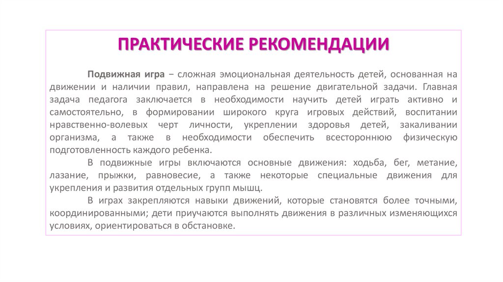 ПРАКТИЧЕСКИЕ РЕКОМЕНДАЦИИПодвижная игра − сложная эмоциональная деятельность детей, основанная на