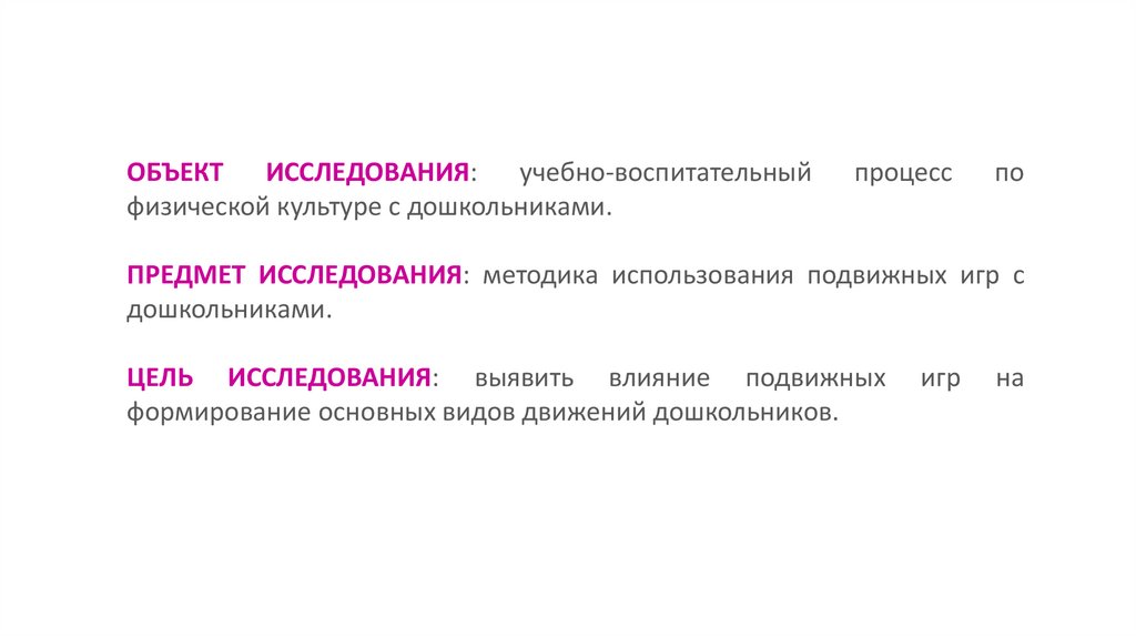ОБЪЕКТ ИССЛЕДОВАНИЯ: учебно-воспитательныйфизической культуре с дошкольниками.