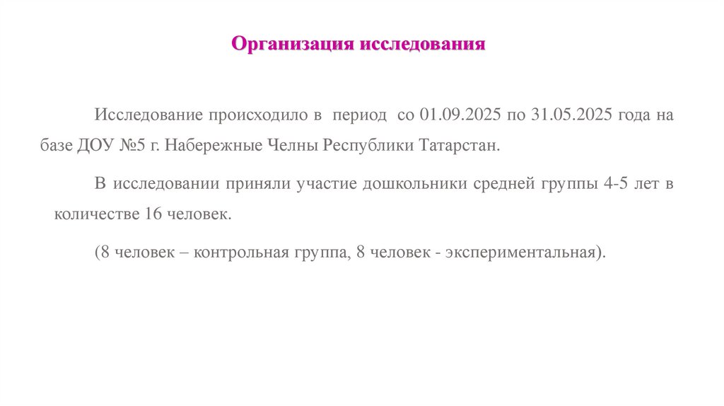 Организация исследованияИсследование происходило в период со 01.09.2025 по 31.05.2025 года на