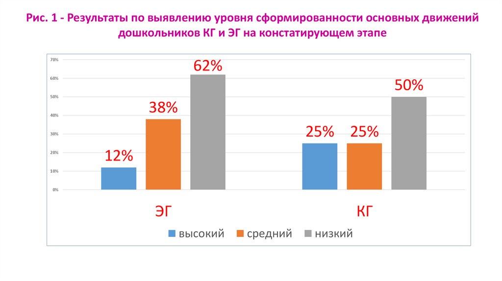 Рис. 1 - Результаты по выявлению уровня сформированности основных движенийдошкольников КГ и ЭГ на констатирующем этапе
