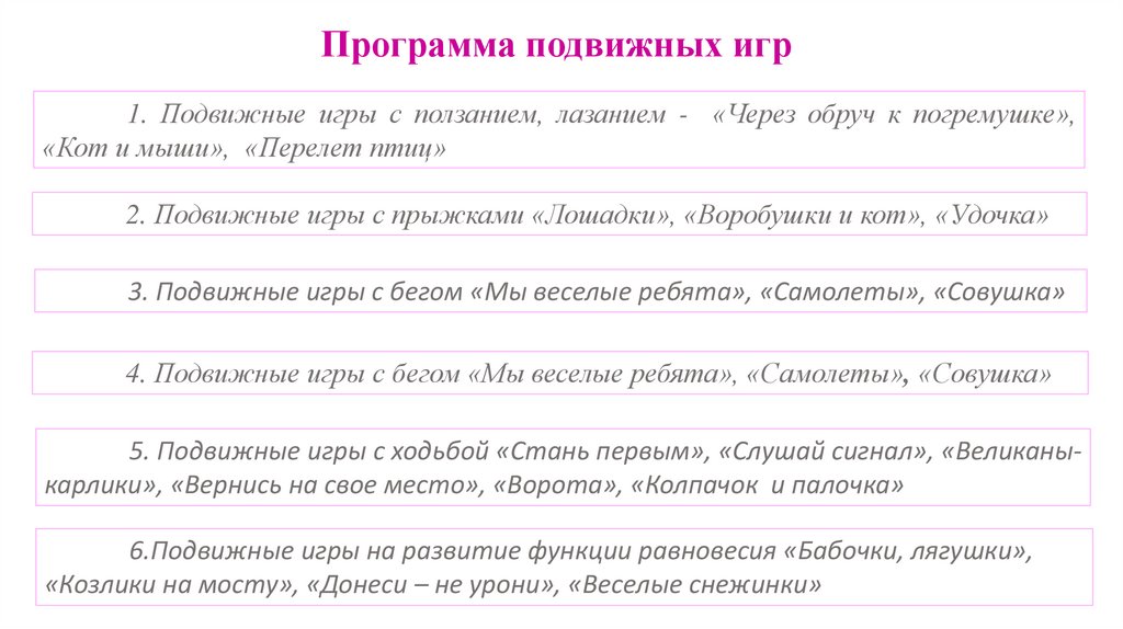 прыжки, метания, лазания и т.д. структуру подвижных игр и взаимодействия