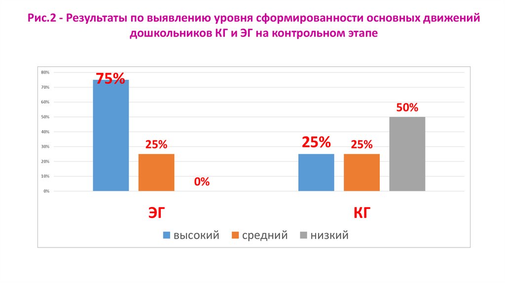 Рис.2 - Результаты по выявлению уровня сформированности основных движенийдошкольников КГ и ЭГ на контрольном этапе
