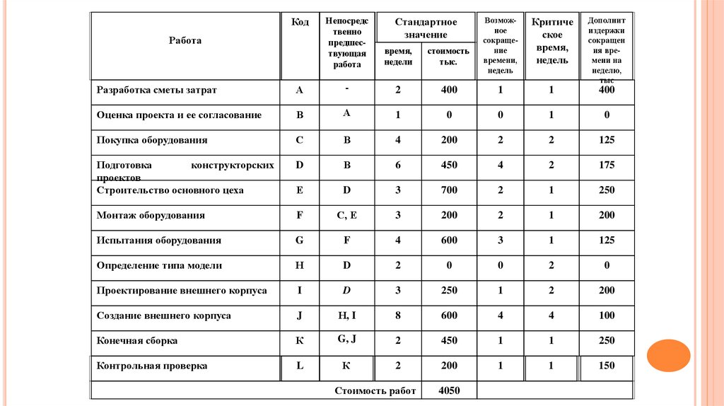 Для стадий B, D и L сокращение невозможно. Дополнительные издержки для сокращения на 1 день каждой стадии находятся по