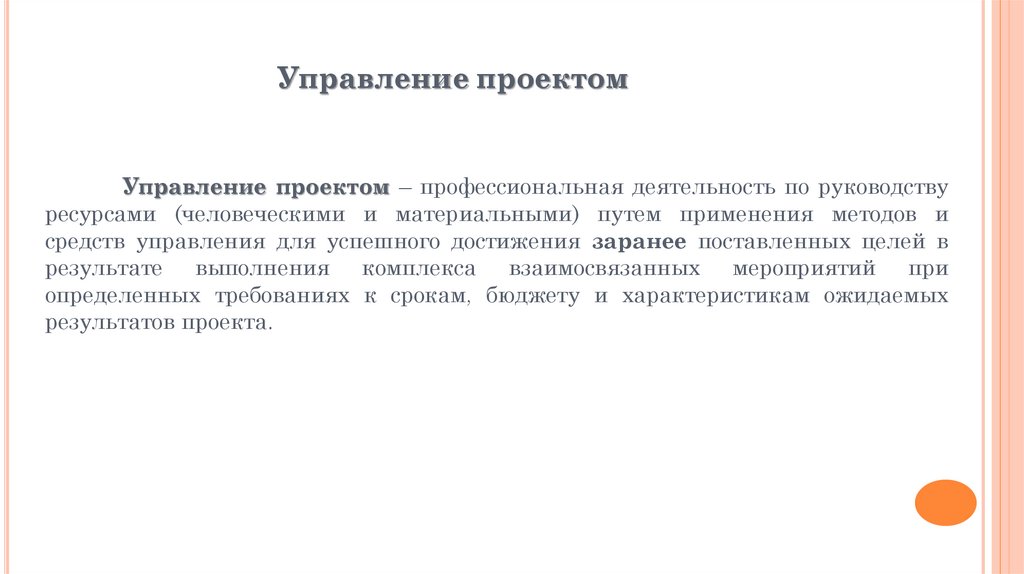 Управление проектомУправление проектом – профессиональная деятельность по руководству