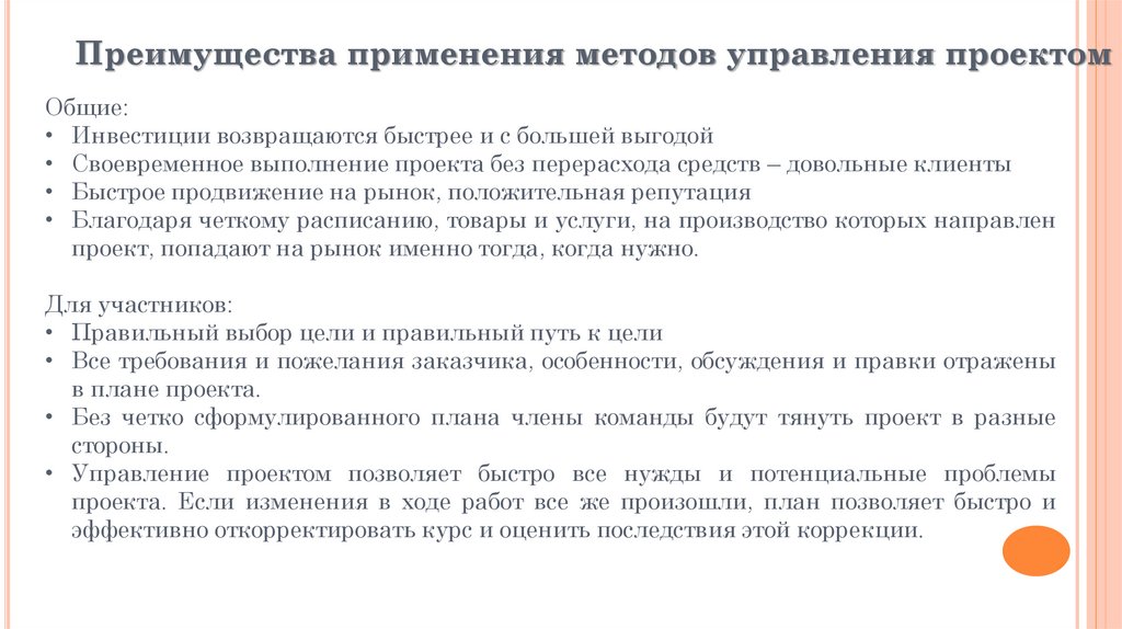 • Управление проектом позволяет быстро все нужды и потенциальные проблемы