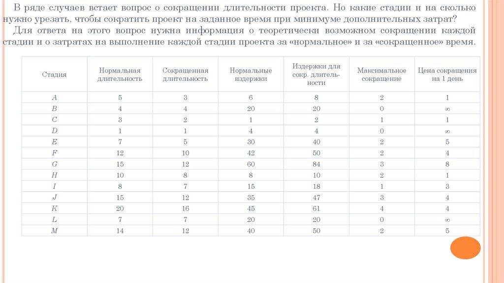 стадии и о затратах на выполнение каждой стадии проекта за «нормальное» и за «сокращенное» время.