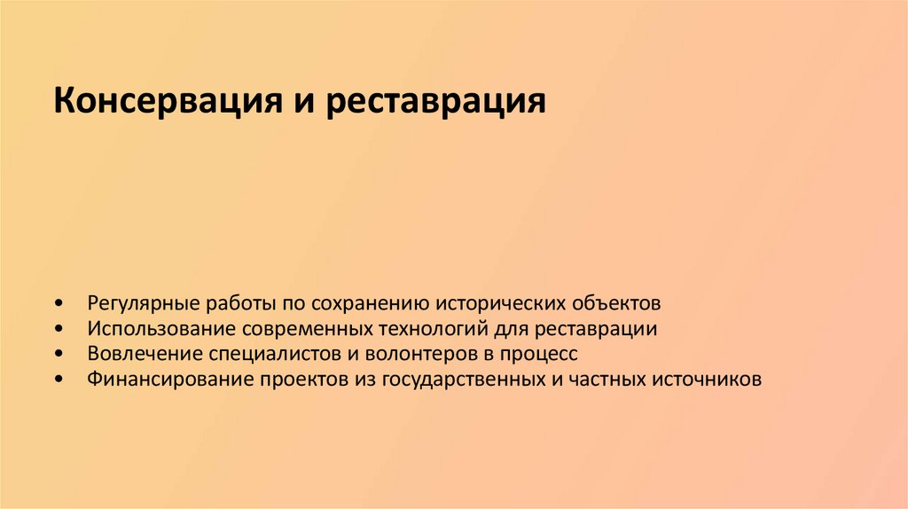 Консервация и реставрацияРегулярные работы по сохранению исторических объектов