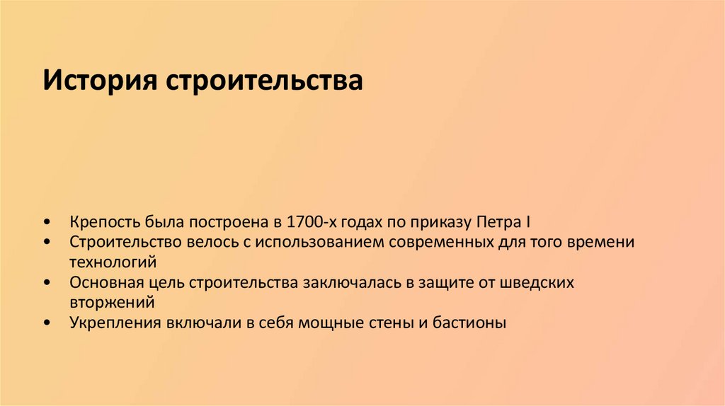 История строительстваКрепость была построена в 1700-х годах по приказу Петра I