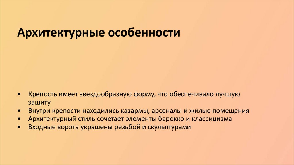 Архитектурные особенностиКрепость имеет звездообразную форму, что обеспечивало лучшую
