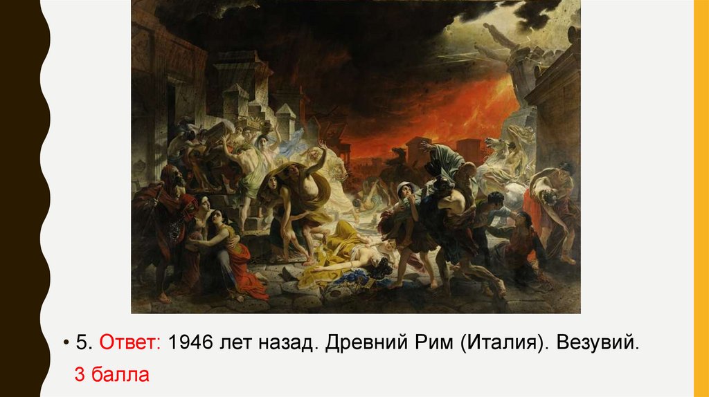 • 5. Ответ: 1946 лет назад. Древний Рим (Италия). Везувий.3 балла
