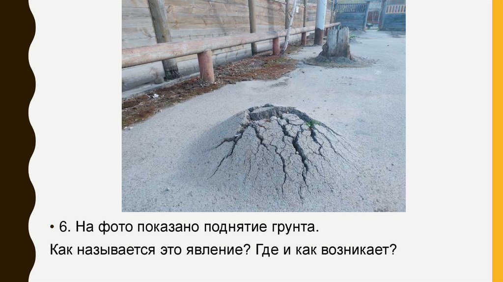 • 6. На фото показано поднятие грунта.Как называется это явление? Где и как возникает?