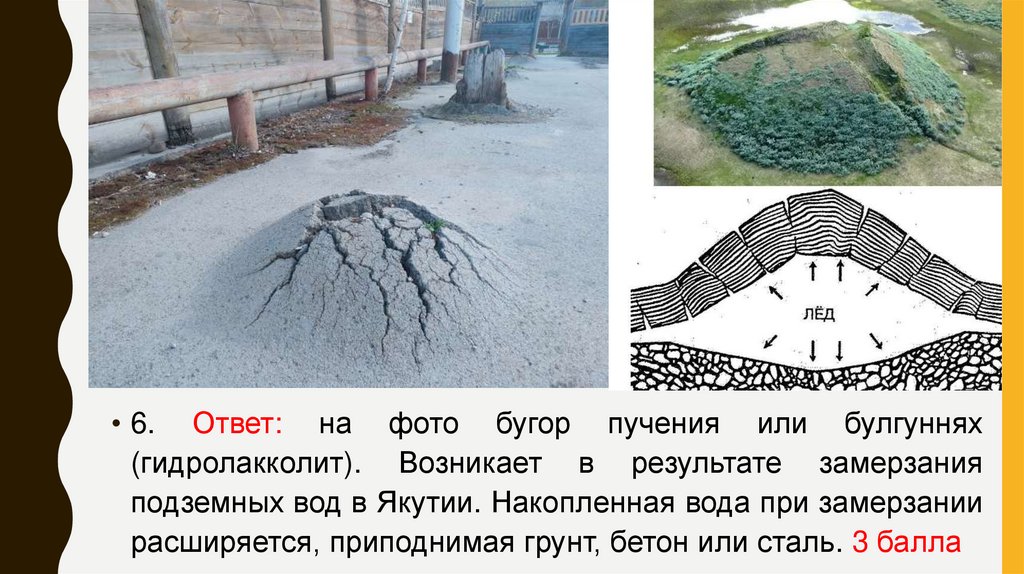 • 6. Ответ: на фото бугор пучения или булгуннях(гидролакколит). Возникает в результате замерзания